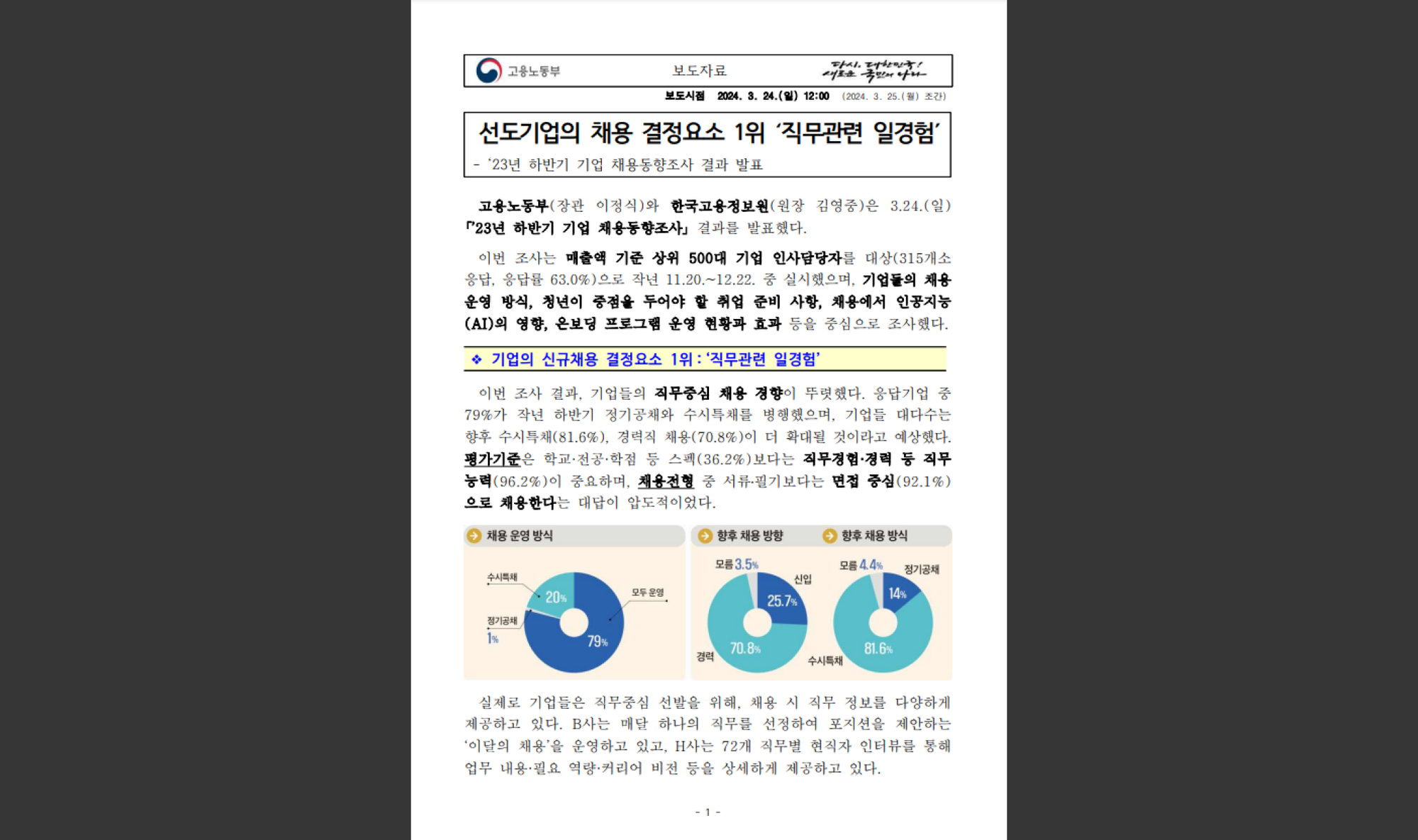 고용노동부와 한국고용정보원이 매출액 기준 상위 500대 기업 인사담당자를 대상(315개소 응답, 응답률 63.0%)으로 조사하여, 24년 3월 24일 「23년 하반기 기업 채용동향조사」를 발표했습니다. 해당 조사에서는 기업의 채용운영 방식, 청년 취업 시 준비 사항, 채용에서 AI의 영향, 온보딩 프로그램 운영 현황과 효과 등을 중심으로 다루었습니다. 이 중, 우리가 주목할 조사결과는 기업의 신규 채용 결정 요소에 대한 부분입니다.