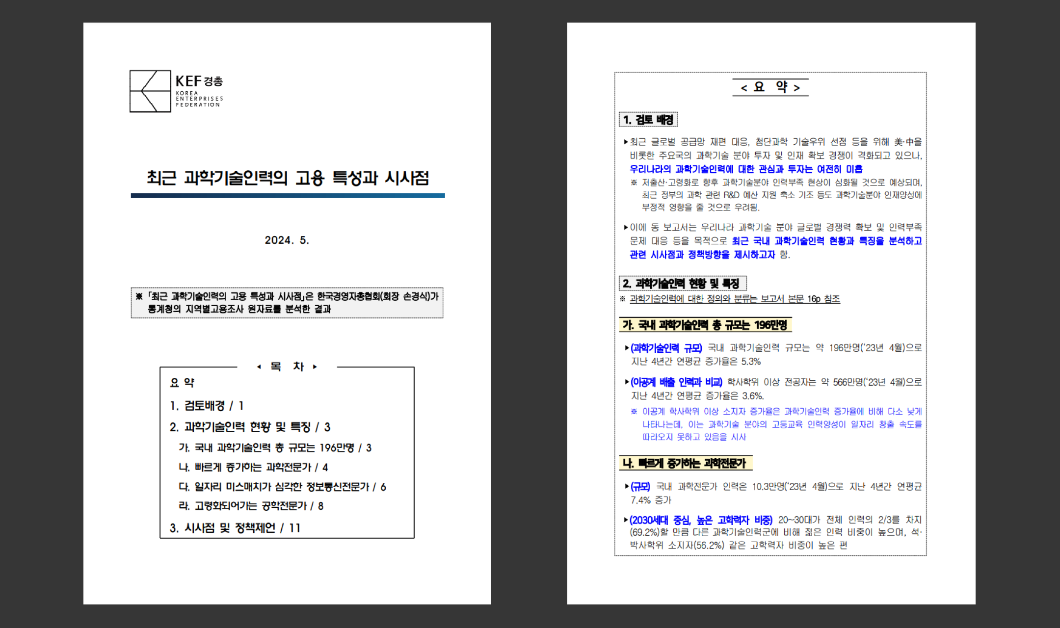 한국경영자총협회가 2024년 5월 28일 공개한 ‘과학기술 인력의 고용 특성과 시사점’ 보고서에 따르면, 최근 4년간 국내 과학기술 일자리 수는 연평균 5.3% 증가한 반면, 이공계 학사 학위 이상 소지자의 증가율은 3.6%에 그친 것으로 조사되었습니다.