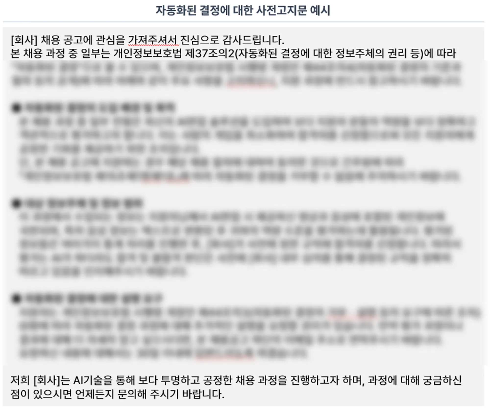 만약 채용 절차가 자동화된 결정 시스템을 사용하는 경우, 응시자는 설명을 요구할 권리가 있으며, 회사는 이에 대해 성실하게 응답해야 합니다(「개인정보보호법 제37조의 2 2항」에 따름).