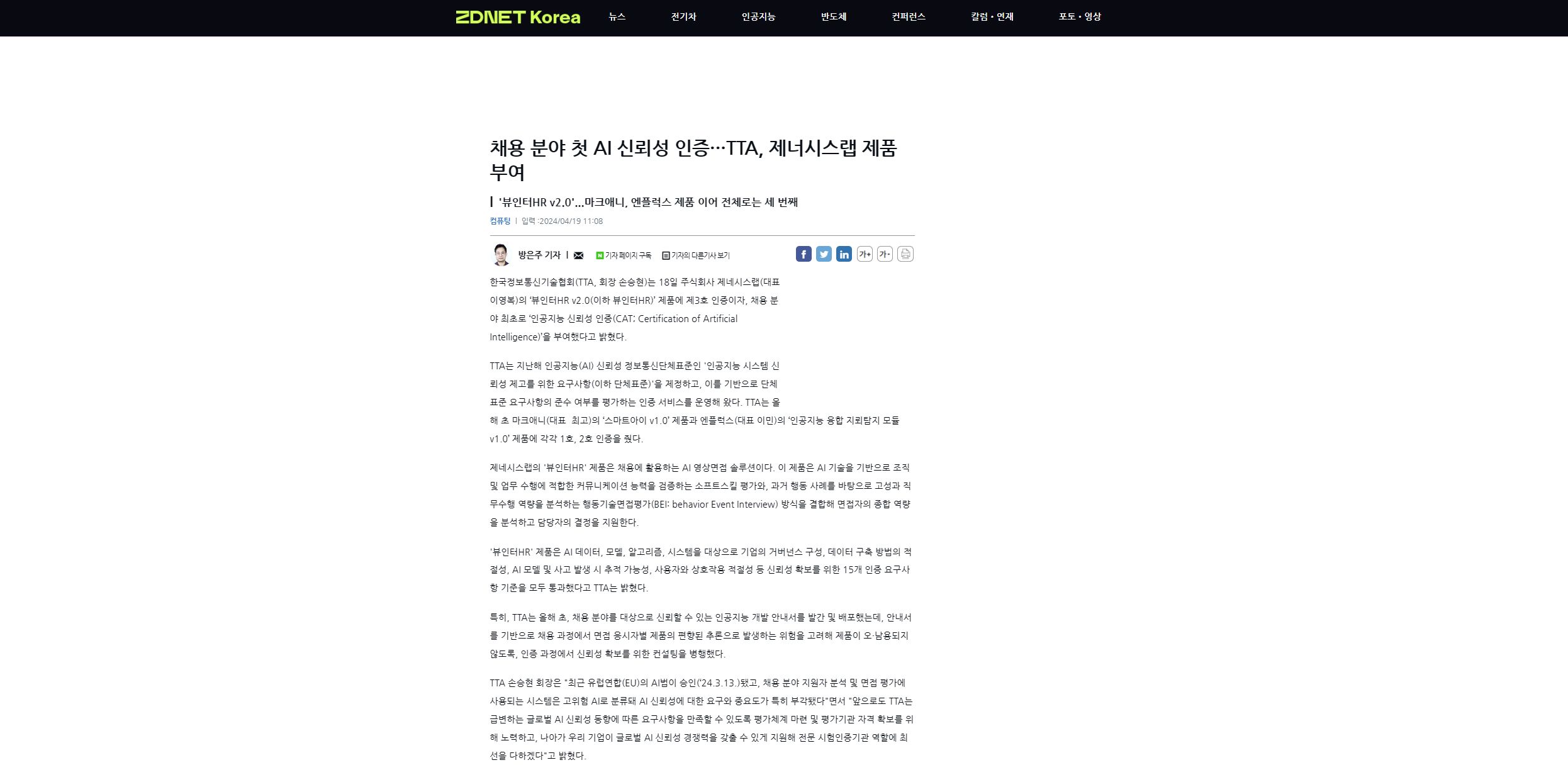 TTA는 제네시스랩의 '뷰인터HR'에 채용 분야 최초로 인공지능 신뢰성 인증을 부여했습니다.